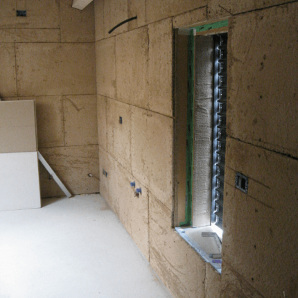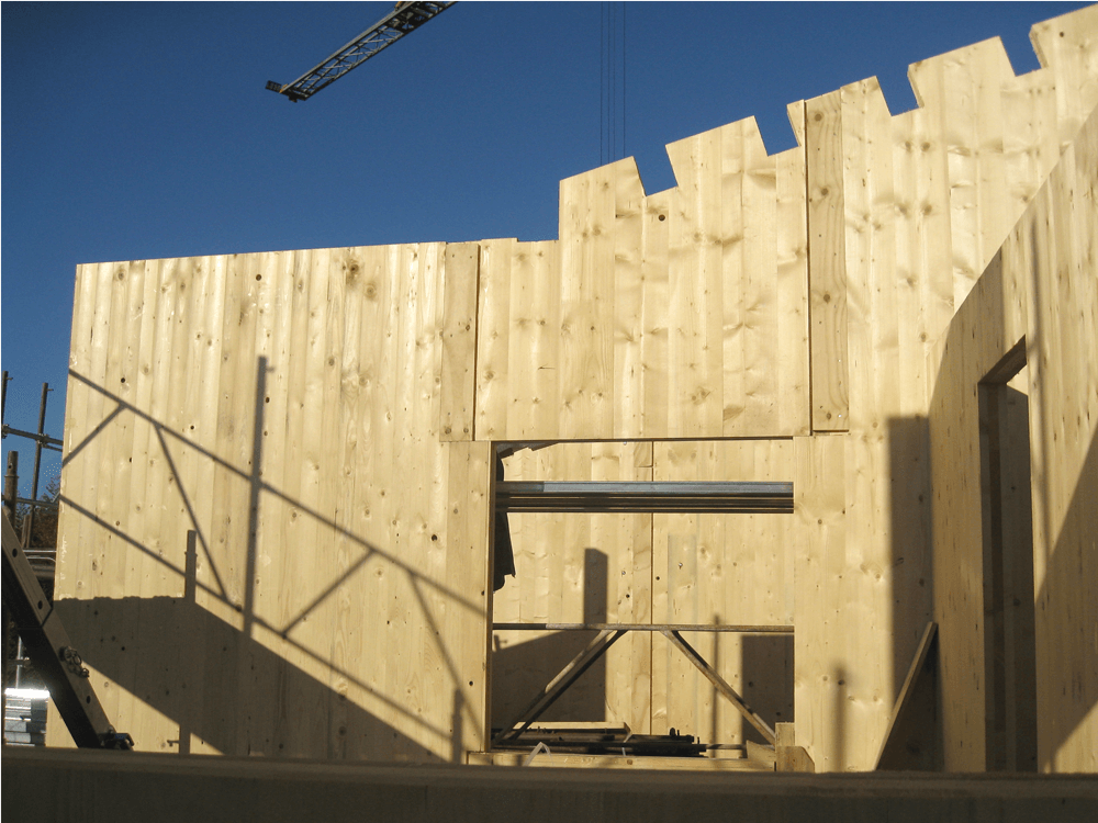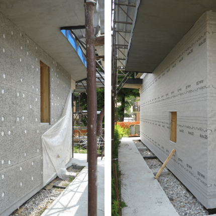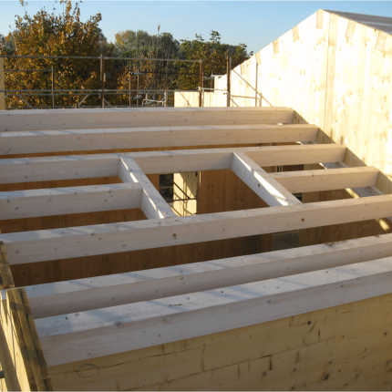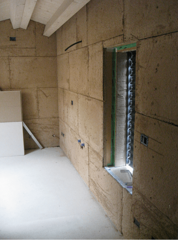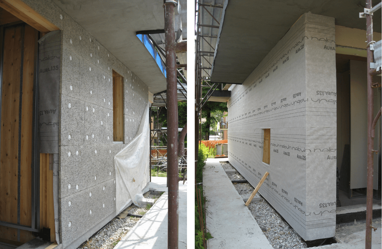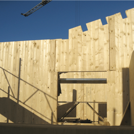 - Pareti perimetrali e portanti: sistema costruttivo in legno costituito da lastre in tavole incrociate (XLAM) e cappotto esterno in fibra di legno ed Eraclit, U=0,16 W/m2 °K.