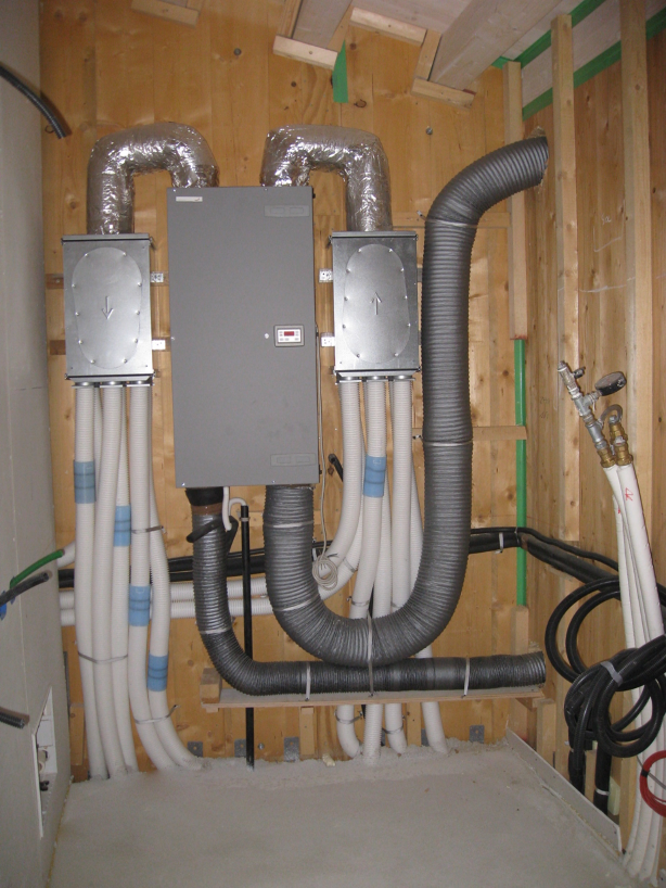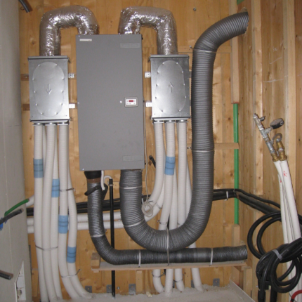 Tramite impianto di ventilazione meccanica controllata per il ricambio dell’aria primaria, consistente in canalizzazioni per l’estrazione dell’aria dagli ambienti interni, scambiatore per il recupero della temperatura dell’aria espulsa, canalizzazioni per l’immissione di aria filtrata dall’esterno agli ambienti interni; il tutto compatibile alle prescrizioni dell’Ente “Casa Clima di Bolzano”.