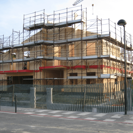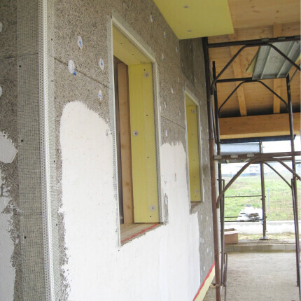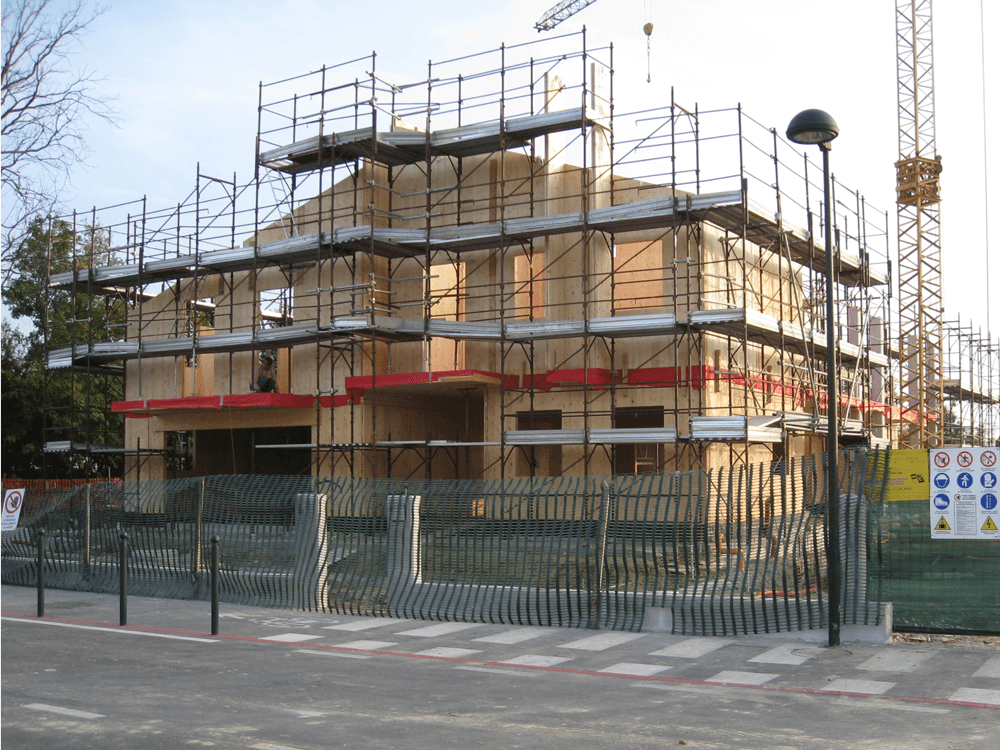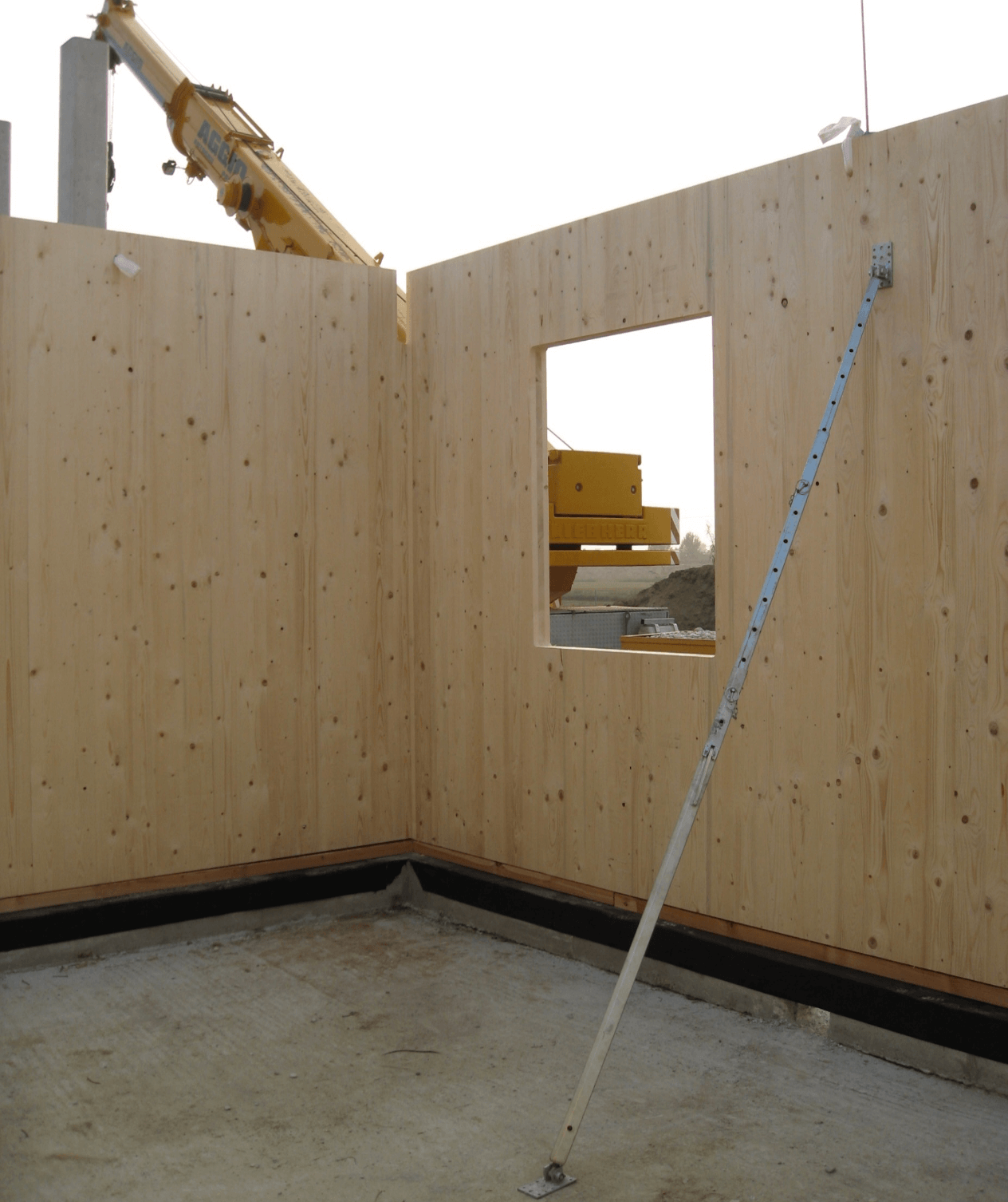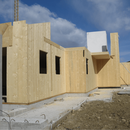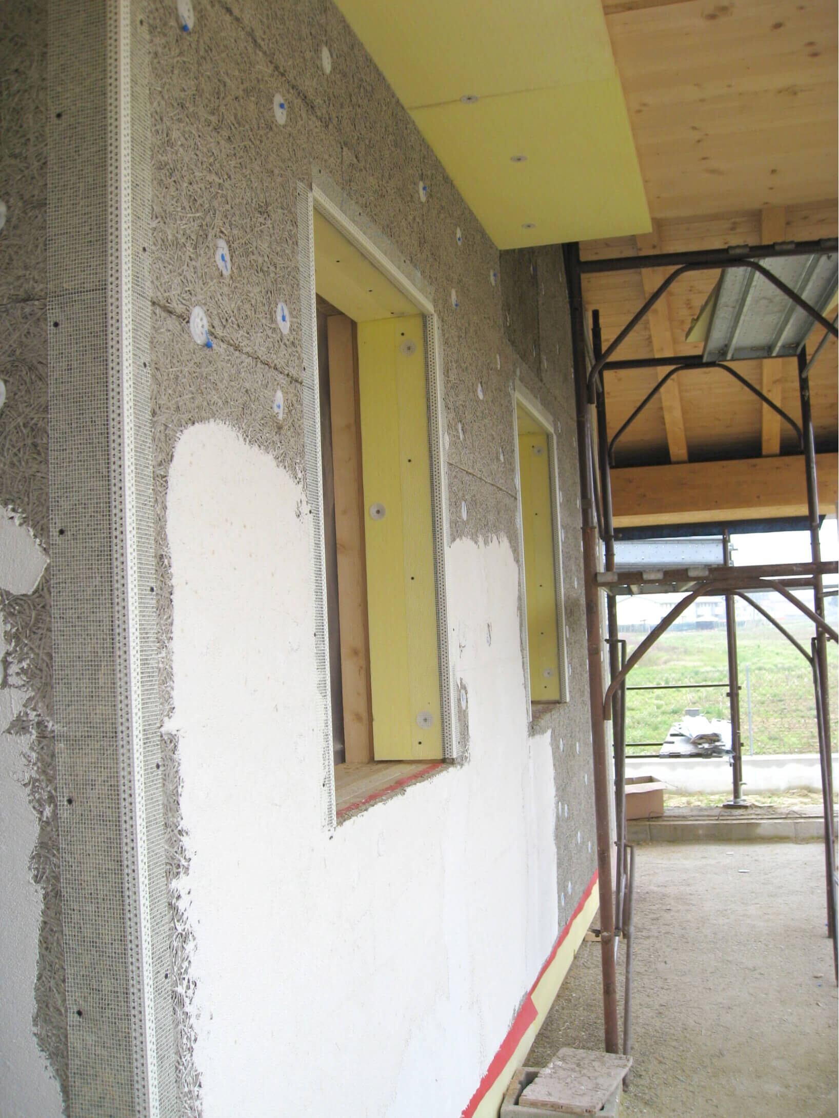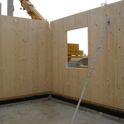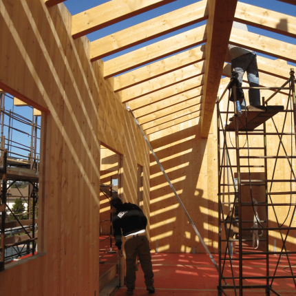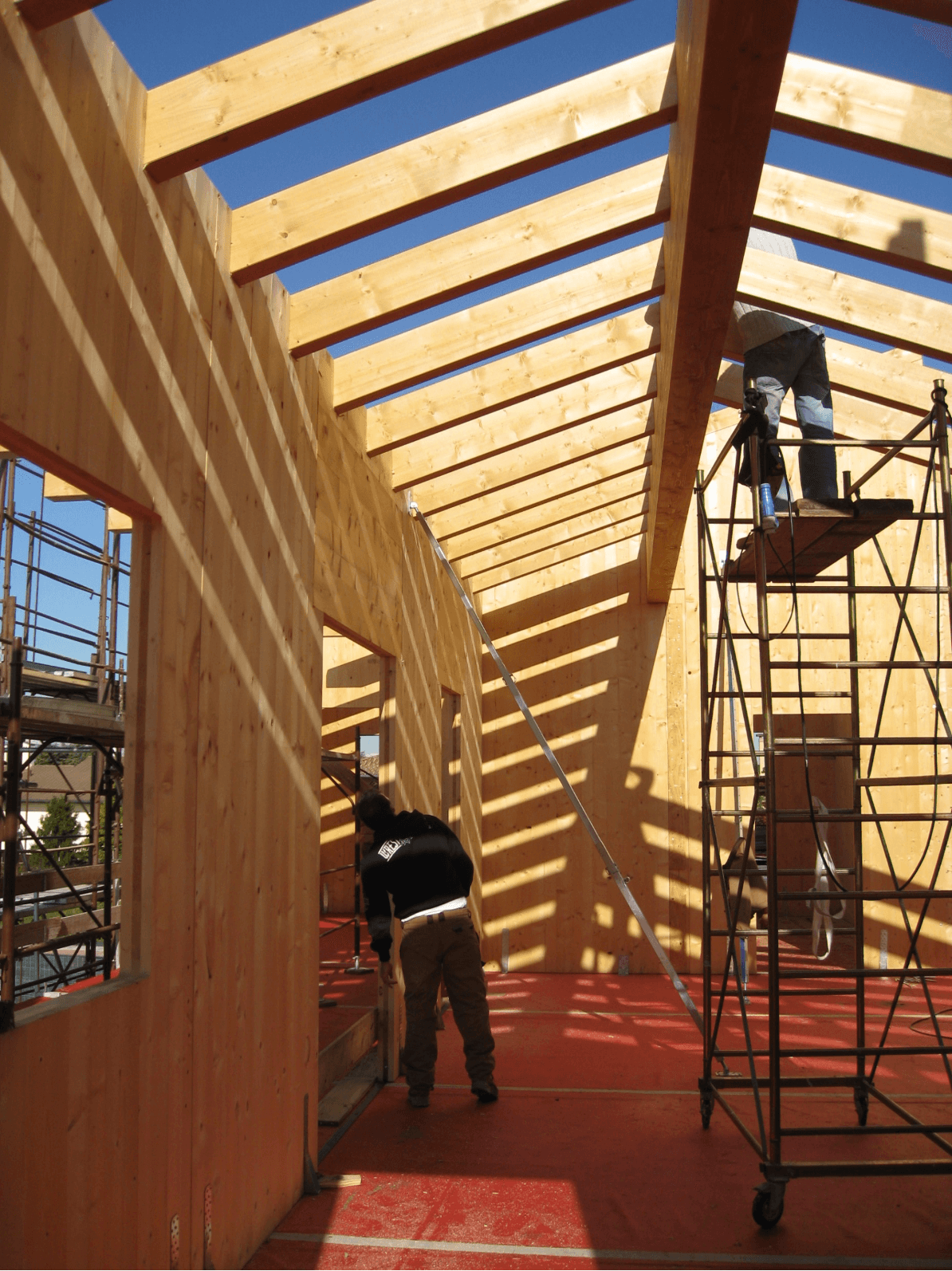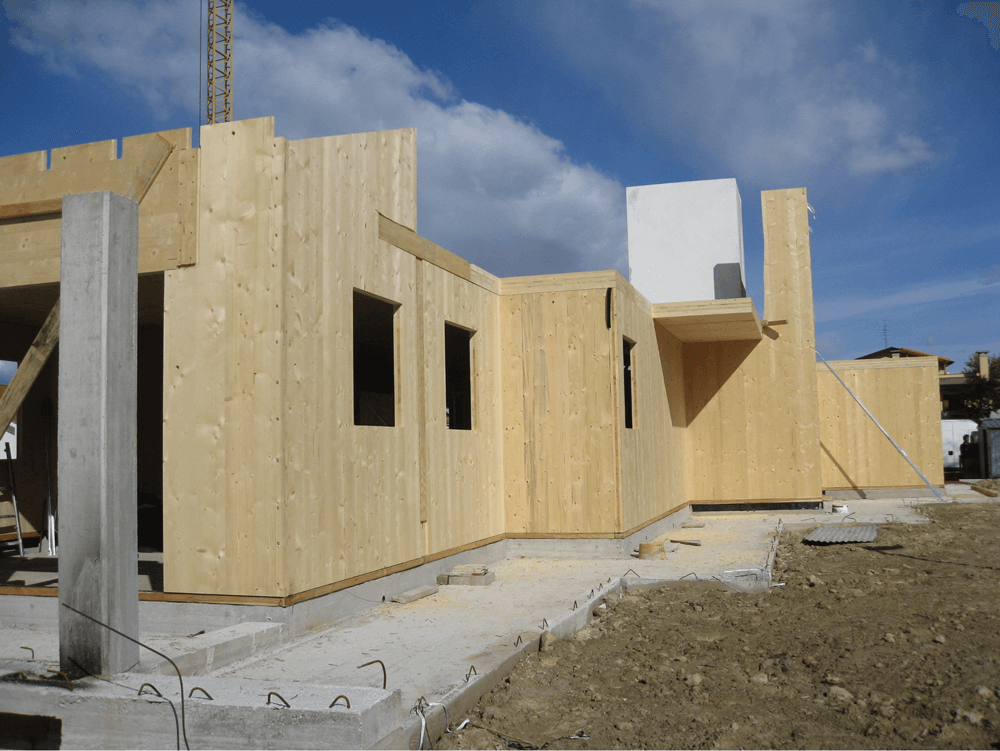 - Pareti perimetrali e portanti: sistema costruttivo in legno costituito da lastre in tavole incrociate (XLAM) e cappotto esterno in fibra di legno ed Eraclit, U=0,20 W/m2 °K.