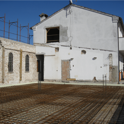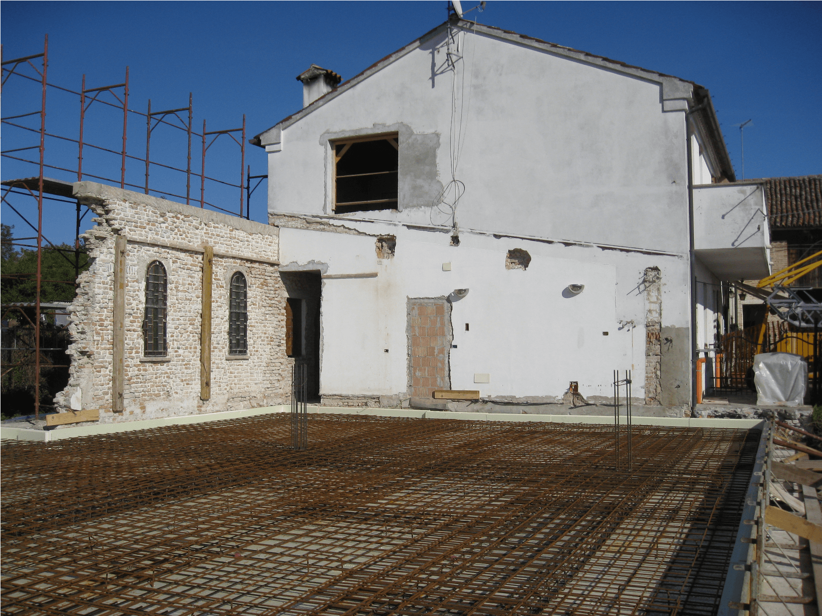 Edificio in muratura di mattoni di laterizio piano da restaurare e parte in ampliamento con Telaio portante in C.A. Pareti perimetrali in muratura a “cassetta” con blocchi di Argilla cruda all’interno e isolante in Fibra di Legno dello spessore di cm. 45,00 ed intonaco a base di calce naturale idraulica all’esterno e di Argilla cruda all’interno, U=0,17 W/m2 °K.