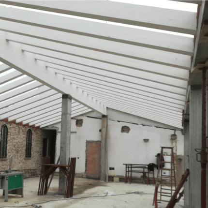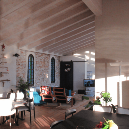 - Copertura inclinata: travi e tavolato in abete e pacchetto isolante composto da pannelli in Fibra di Legno e teli impermeabili traspiranti di cm. 20,00 U=0,18 W/m2 °K T.